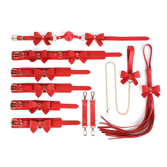 Red SM props set 5-piece bow sexy whip pvc gag female slave traction collar bondage handcuffs